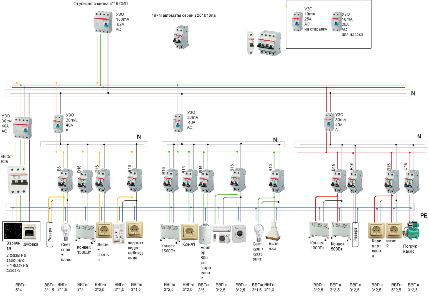 За основу можно взять схему, приведенную . Ее верх, от выхода из счетчика, остается неизменным, нужно только изменить численные данные. Марка УЗО значения не имеет: если вы в конечном итоге поставите вместо АСТРО-УЗО другие, это ничего не нарушает.
