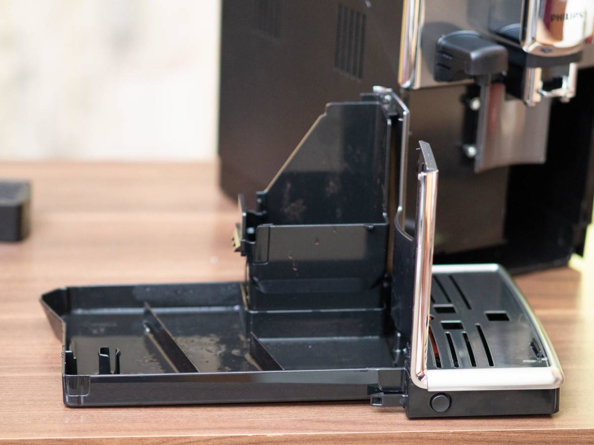 В поддон стекают остатки кофе и вода неиспользованная
