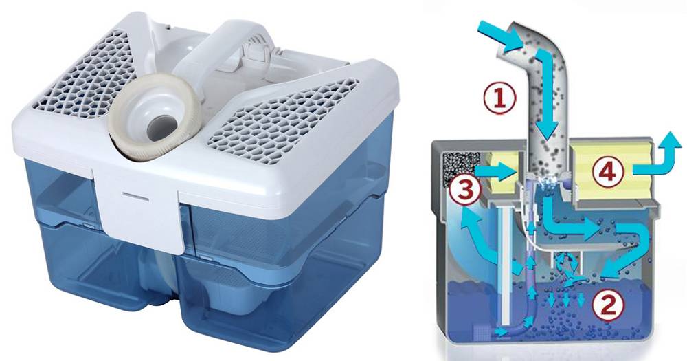 - Aqua-фильтры. Использование этого вида фильтров дает возможность сухой и влажной уборки. Пылесосы, оснащенные ими, дополнительно увлажняют помещение и очищают воздух. Это самый популярный вид пылесосов, но их недостаток в громоздкости, большом весе и необходимости мытья после каждого использования.