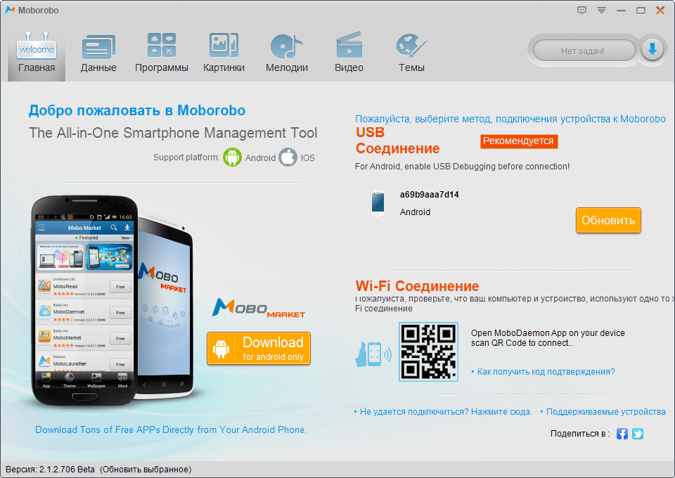 Еще одна неплохая программа — MoboRobo. Распространяется тоже бесплатно. Имеет те же возможности и функции, что у MyPhoneExplorer. Есть одно отличие, это при запуске вы нажимаете не F1, а выбираете мышкой кнопку Refreshing.