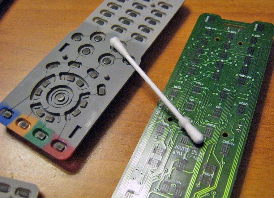 Слой грязи, оказавшийся на клавиатуре сверху или снизу (на плате, контактных площадках), является серьезной помехой в работе пульта. Чтобы восстановить работоспособность, потребуется промыть поверхности спиртом. Для этого используются ушные ватные палочки, влажные салфетки. После высыхания клавиатуру устанавливают в пульт, она должна заработать.