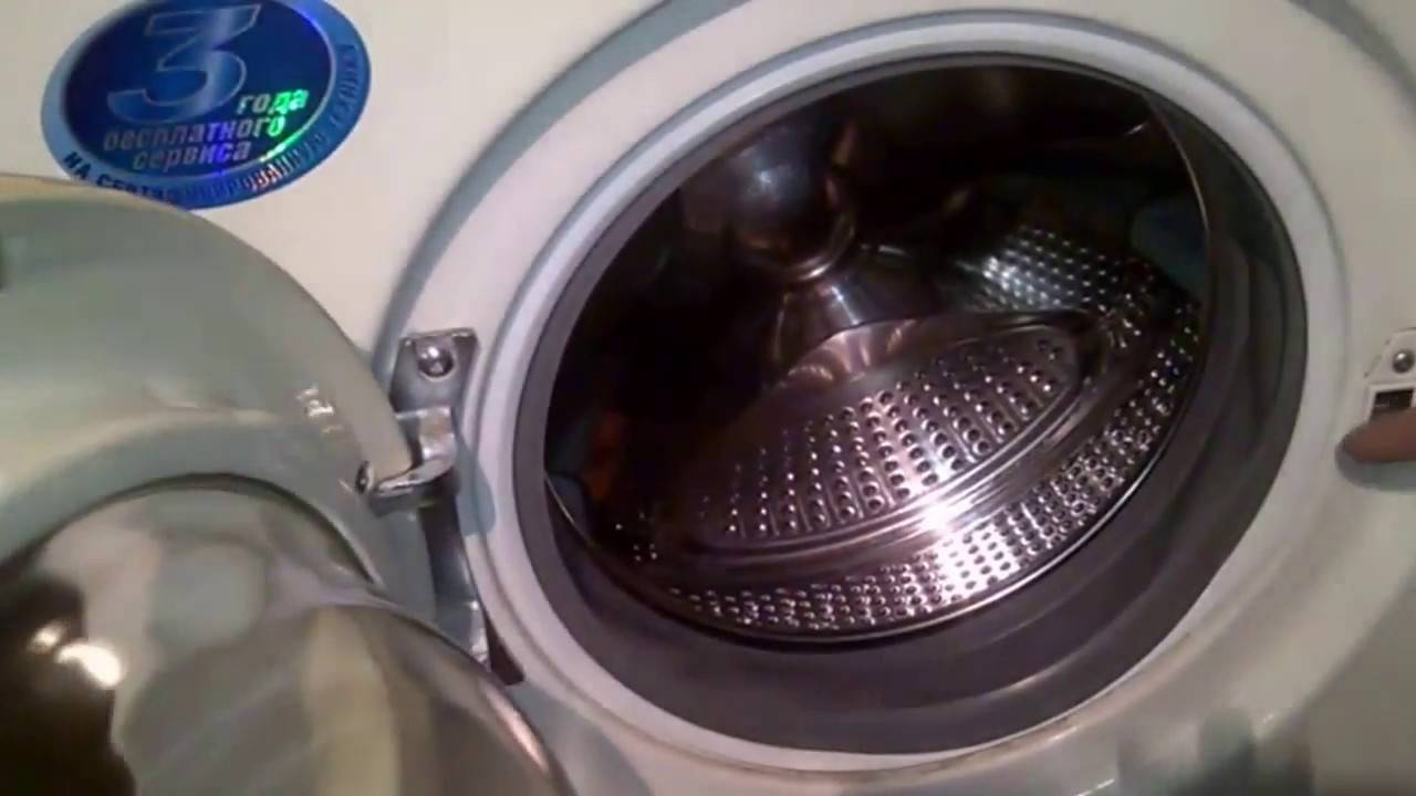 Демонтируют дверцы люка стиралки (располагается в правом нижнем углу корпуса). Для демонтажа необходимо подцепить панель отверткой. После того как дверца будет демонтирована, из открытого отверстия начнет выливаться остаточная вода. Чтобы сохранить чистоту вокруг себя, на пол выстилают тряпки или подставляют под техническое отверстие какую-нибудь емкость.