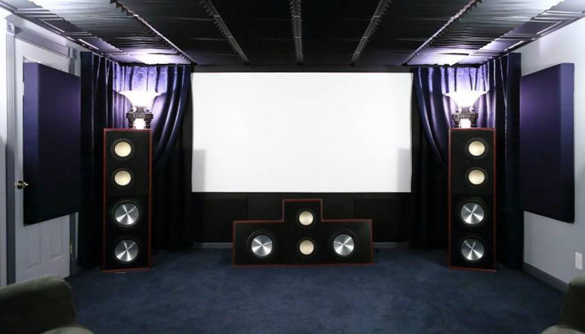 Даже кресла или диваны расставляются продуманно, также следует позаботиться о спцеиальном освещении, которая нужна для создания особой атмосферы.Для усилителя и колонок лучше сделать отдельные полочки, впрочем, для всей техники, входящей в состав домашнего кинотеатра, подготавливаются свои места для более качественной расстановки.Звукопоглощающие ткани на стенах станут лучшим дополнением для звукоизоляции, так как таким образом можно обеспечить улучшение качества звука, что тоже немаловажно