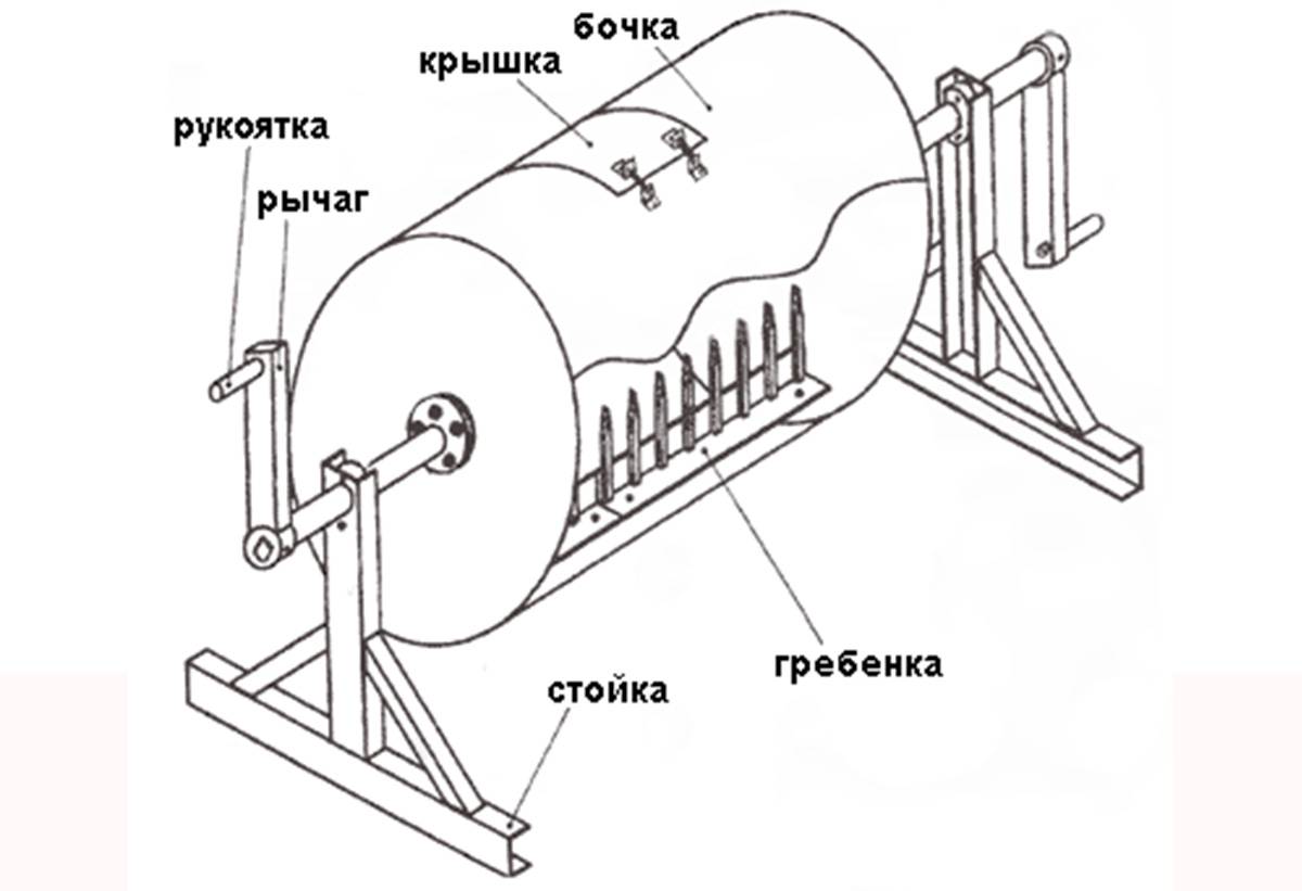 - С обеих сторон бочки или другого резервуара следует просверлить отверстия, которые будут соединять вал с барабаном.
