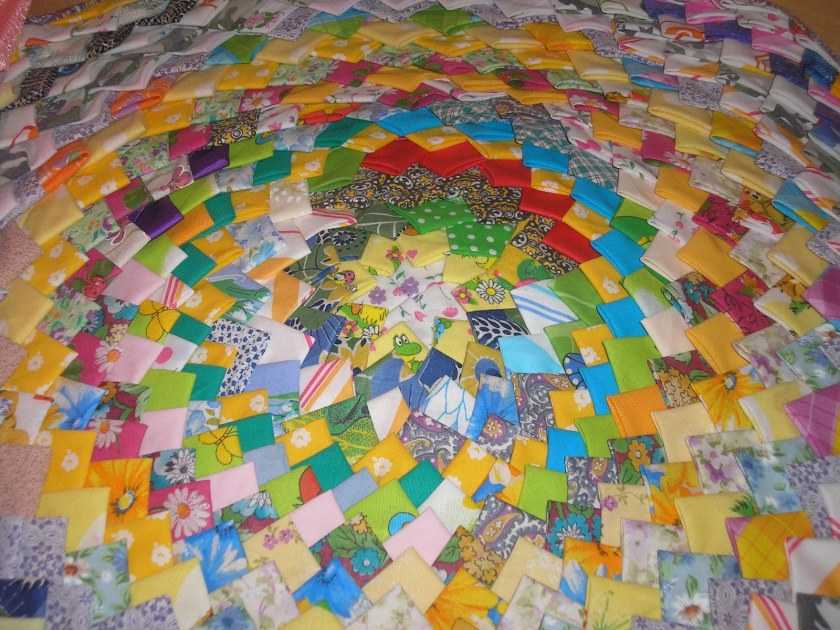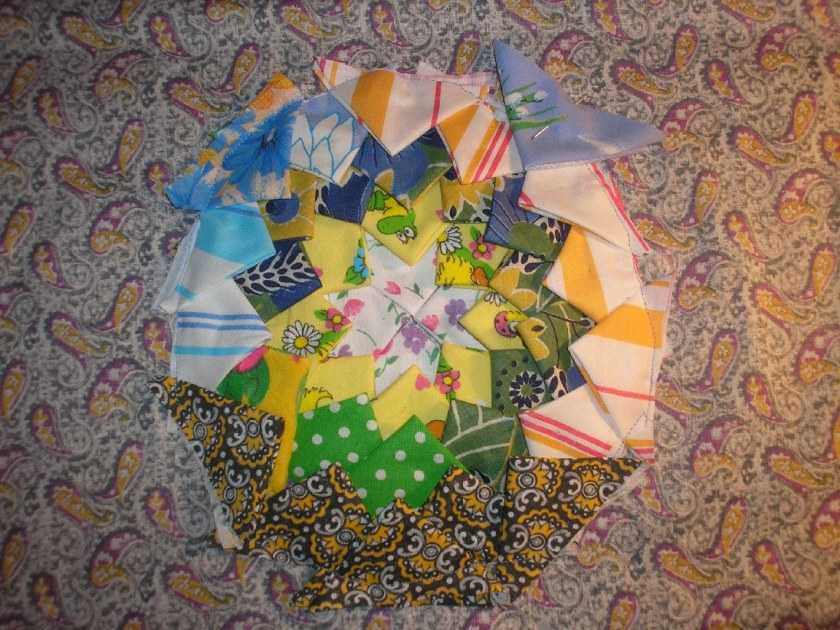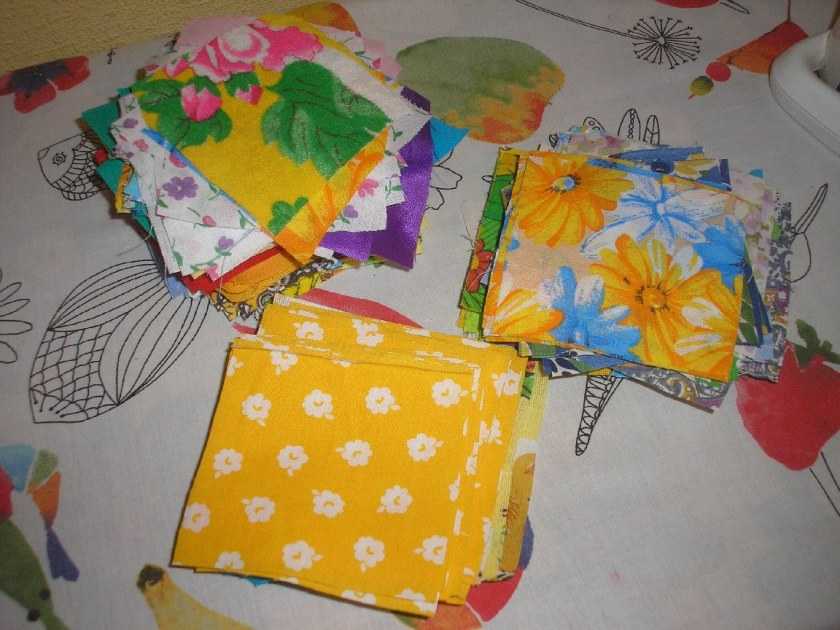 Нарезая по единому шаблону имеющийся материал, разложите сегменты будущего коврика на полу, чтобы визуально оценить цветовое сочетание.