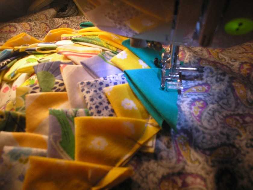 * Начните делать вертикальные строчки, пришивая ткани. При желании можно сделать несколько строчек для прочности.