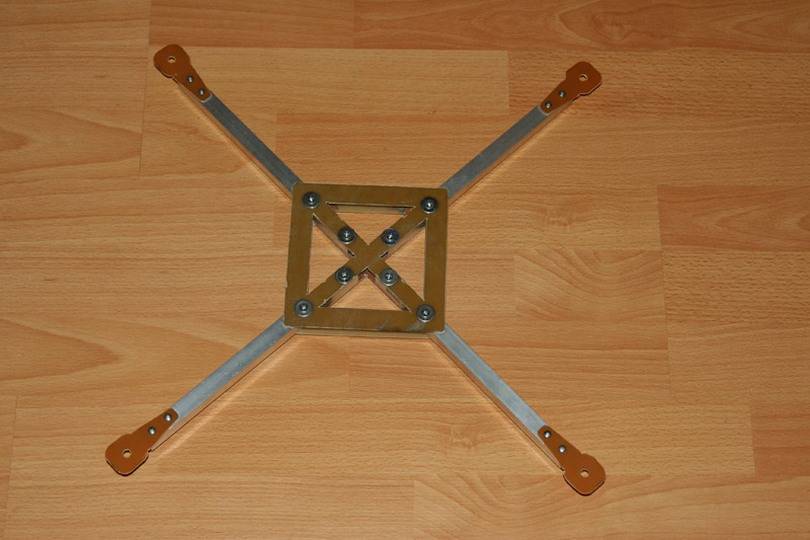Рама. Ее можно сделать без особого труда из пластиковых труб небольшого диаметра, используемых в прокладывании канализационных и иных коммуникаций. Можно изготовить раму из куска фанеры. Понадобится квадрат 110 на 110 мм. Кроме того, потребуется алюминиевый профиль (квадратный). Лучи (длиной по 495 мм) прикрепляются винтами по обеим диагоналям получившегося квадрата. Возможна покупка готовой рамы (рис. снизу).\