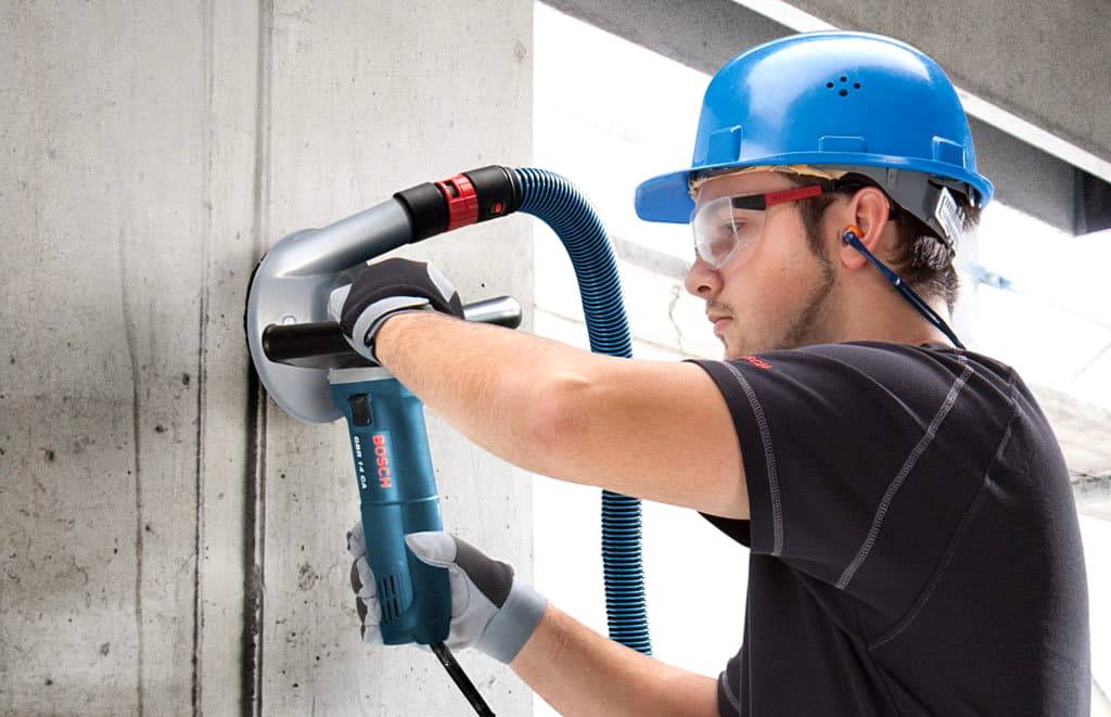 - Необходимо использовать защитные очки, перчатки и респиратор. Установленные насадка и система отвода пыли не обеспечивают полной защиты оператора от летящих осколков бетона.