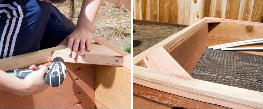 - соединить брус друг с другом с помощью саморезов или уголков, можно использовать скобы.