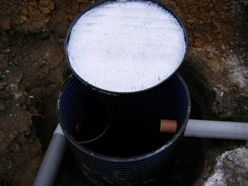 Утепление выполняется только в верхней части “колодца”. Здесь лучше всего воспользоваться влагостойким пенополистиролом толщиной 10–20 см. Сверху камеры закрываются крышками из железобетонных плит с отверстием под смотровой люк.