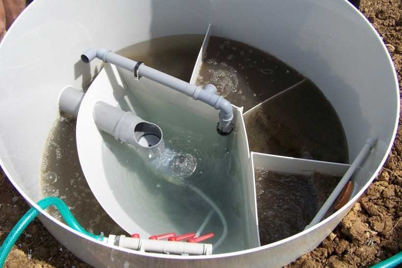 - отстойник. Состоит из 1-й, 2-х или 3-х камер с герметичным днищем. В ходе отстаивания тяжелые нерастворимые фракции оседают на дно, легкие — всплывают, а частично очищенная (осветленная) вода по переливной трубе поступает в следующую камеру. Чтобы в трубу не попадали всплывшие загрязнения, она на входе загнута книзу (обычно крепят вертикально тройник);