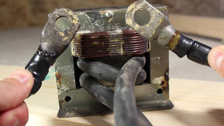 Напряжение на выходе трансформатора получилось чуть более 2-х вольт, но сила тока — около 800 Ампер! Это достаточный ток для того чтобы обеспечить прочное соединение при сварке металлов.