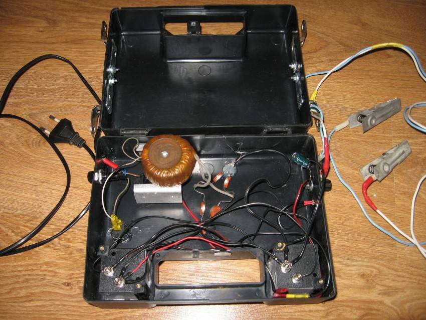- Источник питания. В самом простом виде это переделанный своими руками трансформатор с защитным автоматом в первичной цепи.