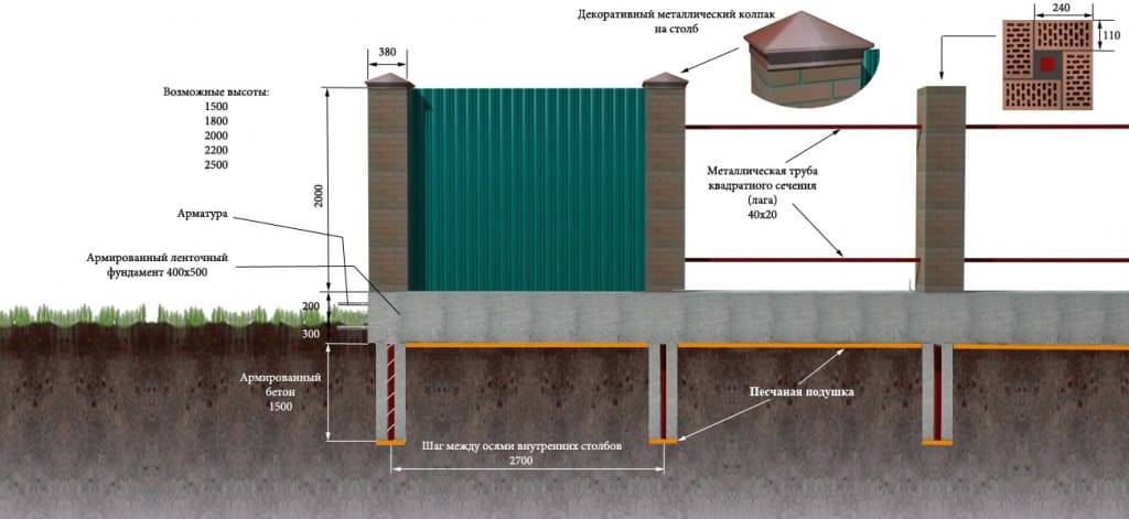 Материалы и комплектующие для строительства заборов из профнастила с кирпичными столбами