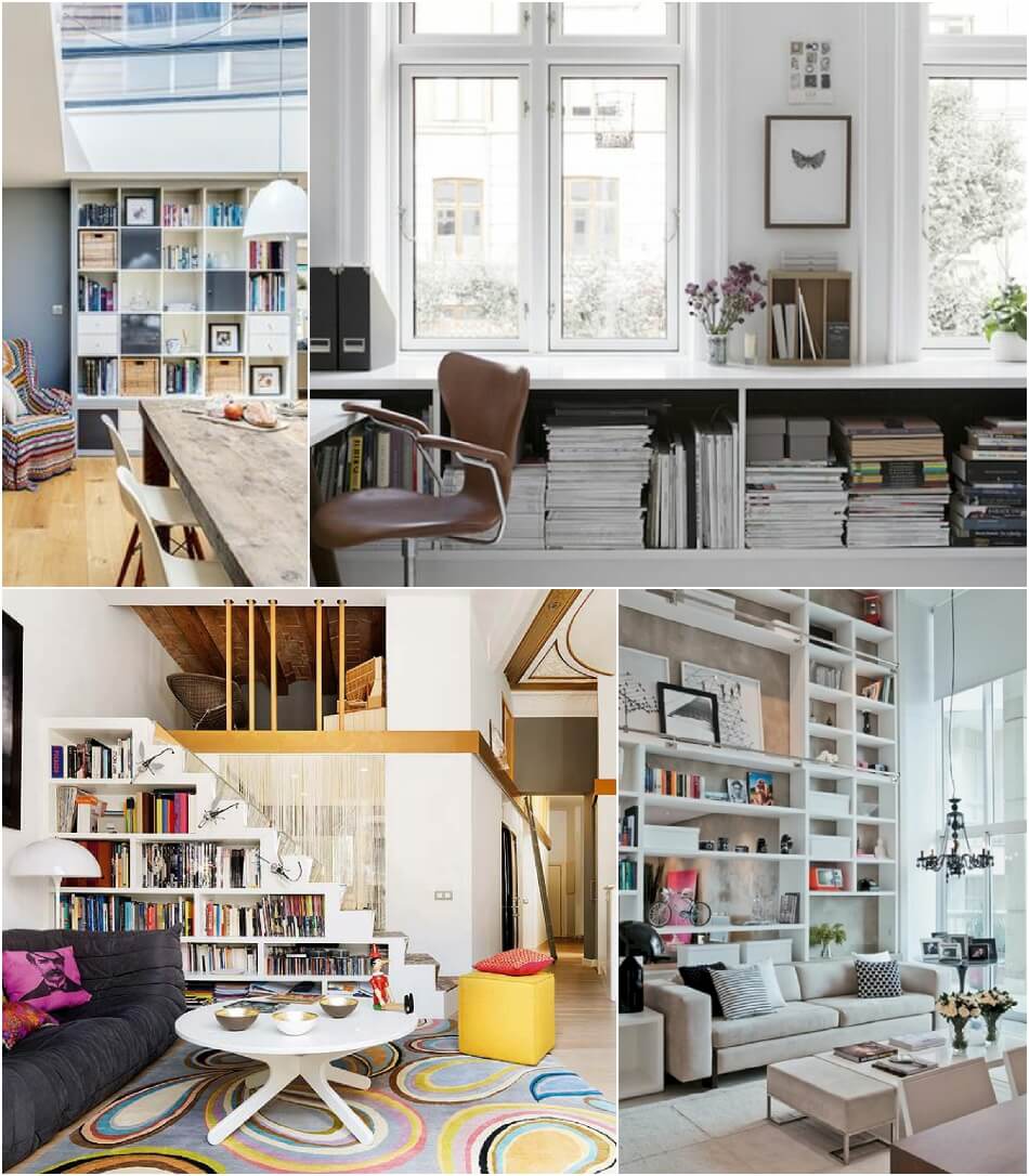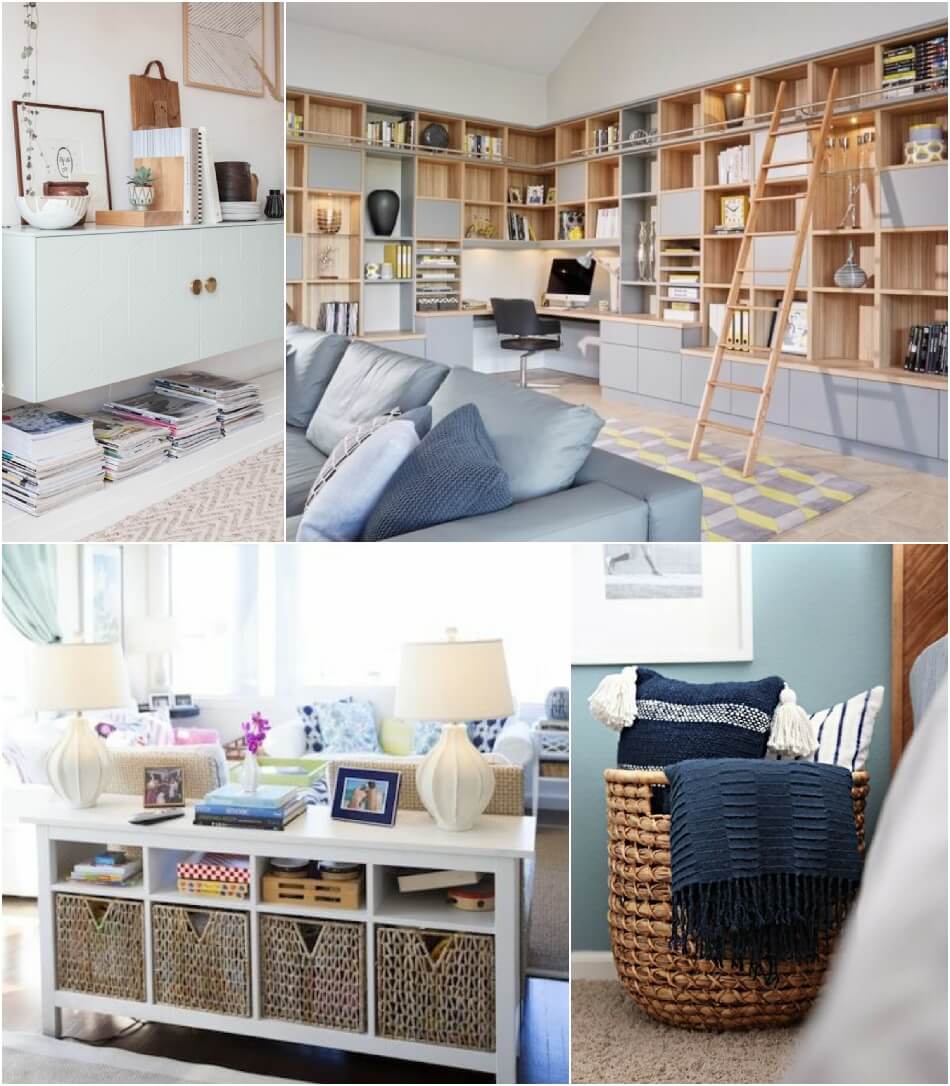 Организация специальных стеллажей – самый удачный вариант того, где хранить вещи в гостиной комнате. Эти стеллажи можно прикрепить вплотную к стене, или использовать их в качестве перегородки для зонирования гостиной комнаты. Чтобы они идеально вписались в дизайн гостиной, следует устанавливать на полки стеллажей не только функциональные вещи, но также декоративные предметы, подчеркивающие стиль помещения. Например, это могут быть книги, красивые вазы и элегантные статуэтки, которые будут перемежаться с коробками для хранения мелких вещиц. Еще один вариант, где хранить вещи – ящики в креслах-трансформерах или в диванах. Также с этой целью пригодятся подставки для ног, представляющие собой пустую коробку с крышкой. Еще один удачный вариант – журнальный столик с ящичками.