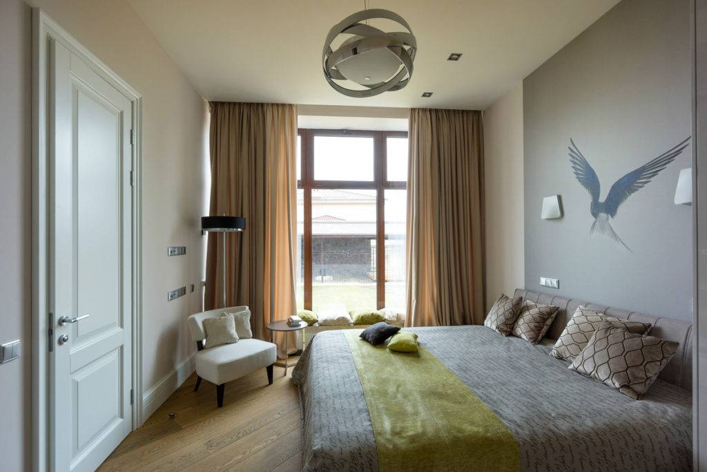 Центральный элемент интерьера спальни — кровать. Она подбирается по уровню комфорта и эргономичности, и должна быть настолько большой, насколько позволяют габариты помещения.