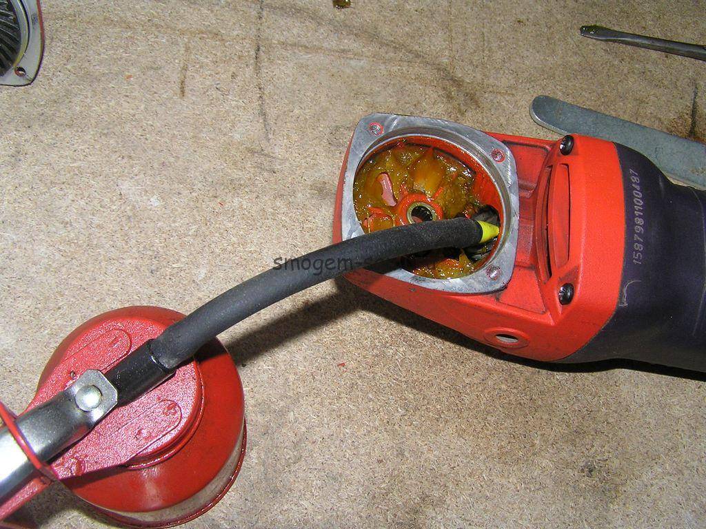 Иногда, в разгар интенсивных работ по скашиванию травостоя, ваш триммер начинает издавать неприятные, скрежещущие звуки. Это жалуется на отсутствие смазки редуктор – наиболее интенсивно нагруженный узел устройства. А вскоре за этими «предупреждениями» может последовать и заклинивание привода…