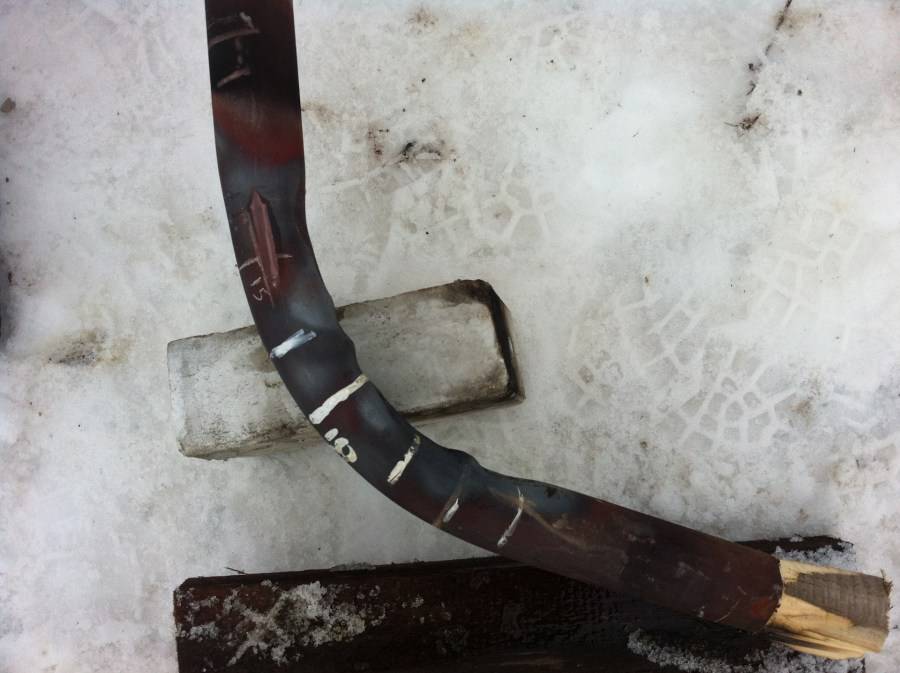 - Для обработки заготовки воспользуйтесь шаблоном с требуемым радиусом изгиба. Его легко выточить из дерева, пропитанного креозотом. Исходный элемент разместите на шаблоне и тщательно закрепите. Возьмите резиновый молоток и несильными ударами придайте необходимую форму сгиба.