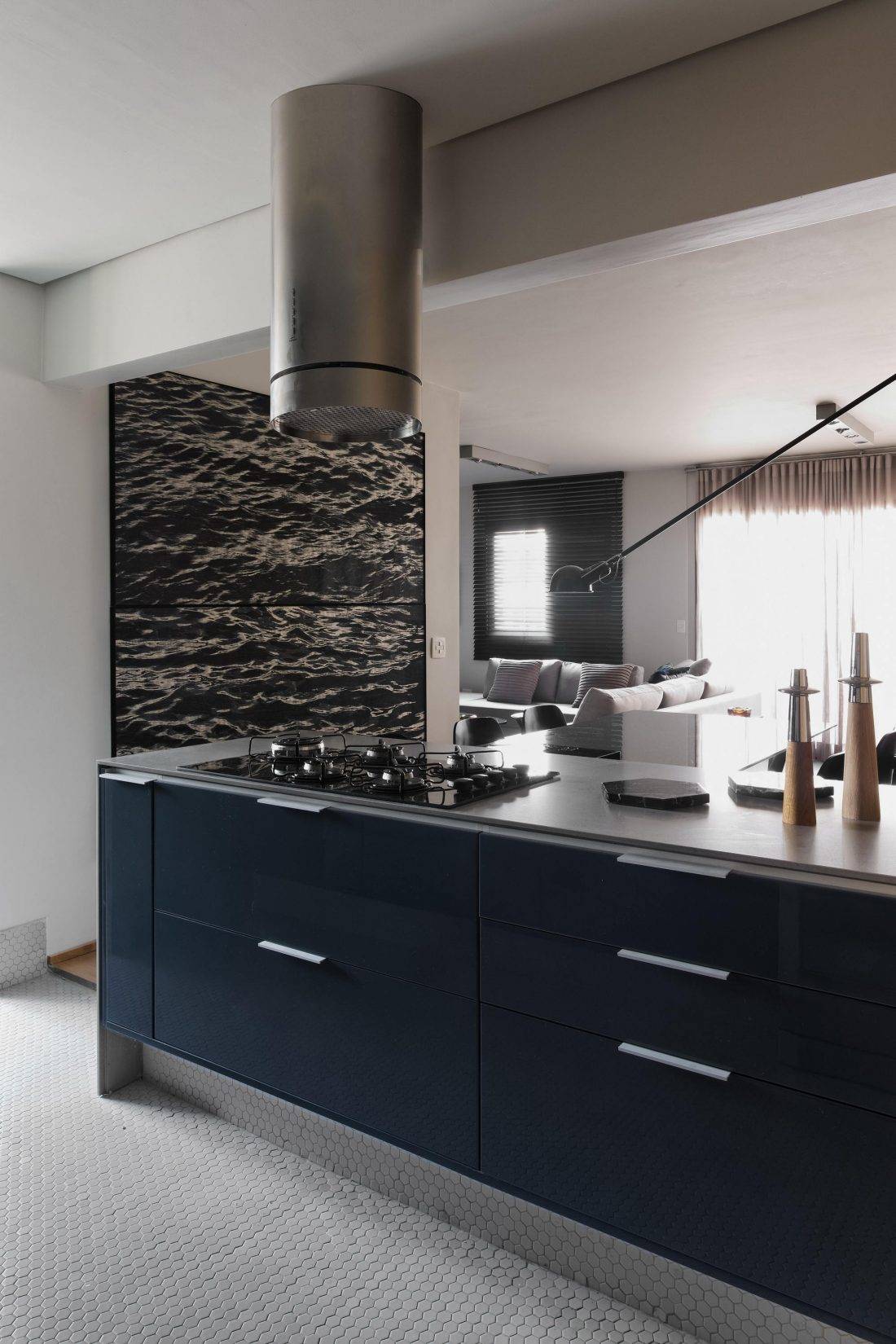 Кухонная зона обозначена частью стены и встроенным в нее рабочим островом. Она выполнена с использованием темных и светлых оттенков серого и напоминает каменный берег моря. Приятный темно-синий цвет глянцевых фасадов обдает свежестью. Большое настенное изображение мраморной текстуры отражается в глянцевой поверхности газовой плиты, выполненной в стиле ретро, и перекликается с каменными шестиугольниками. Тема простой геометрии 60-х продолжена орнаментом на мягком виниловом покрытии пола и части стены.