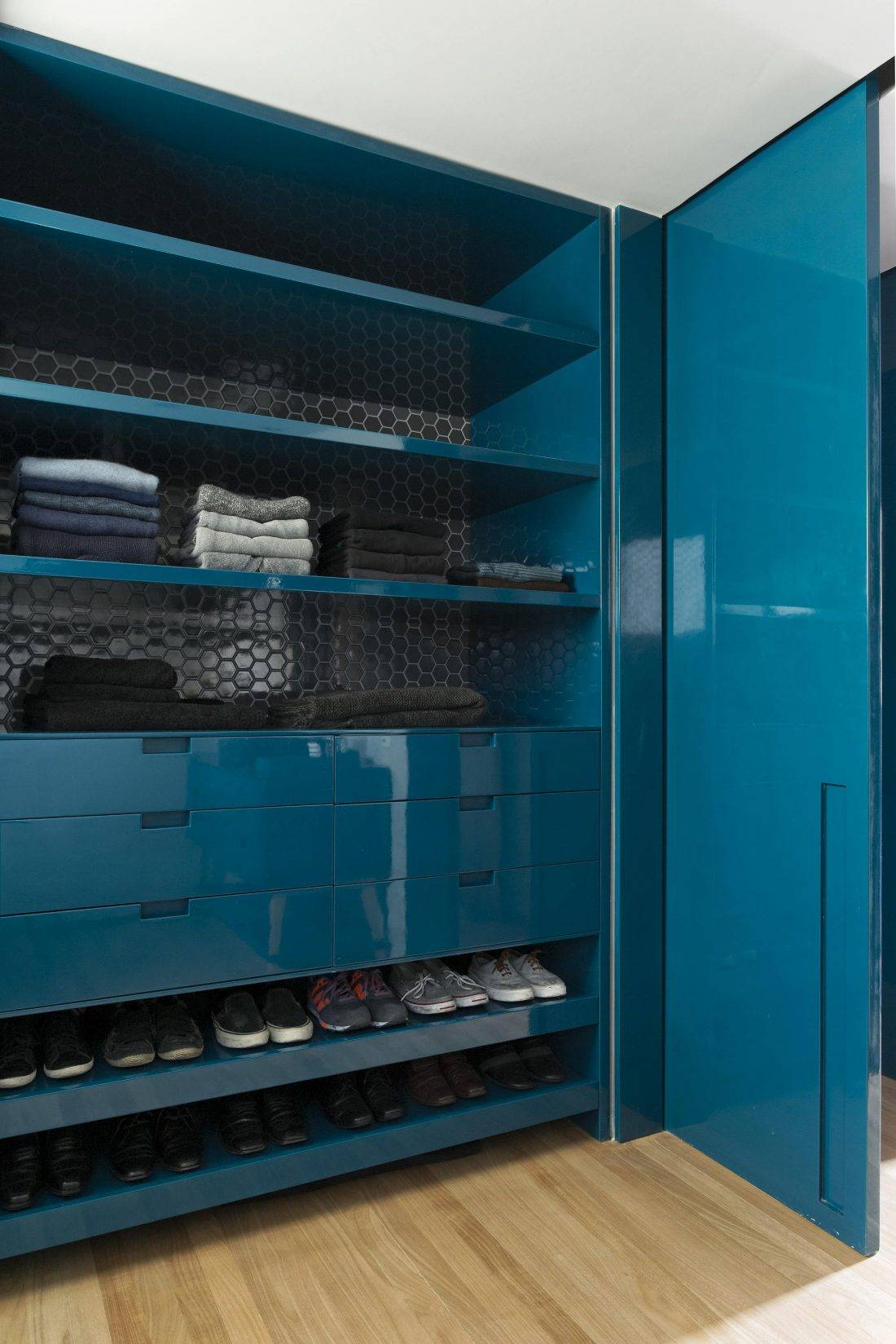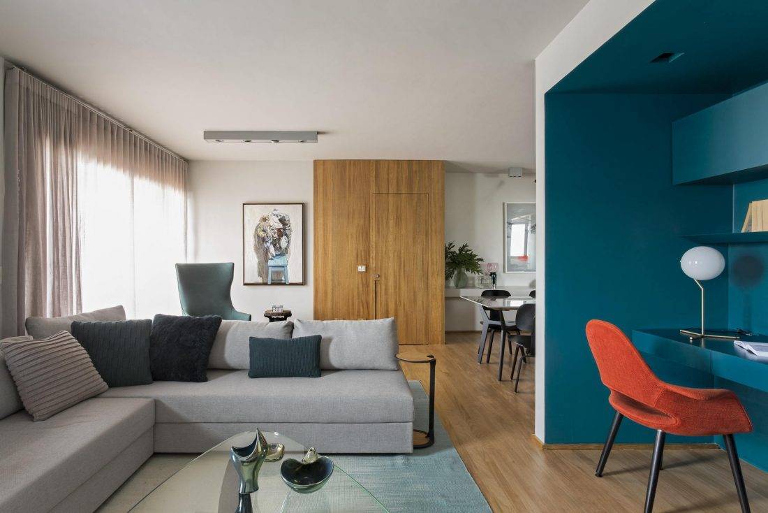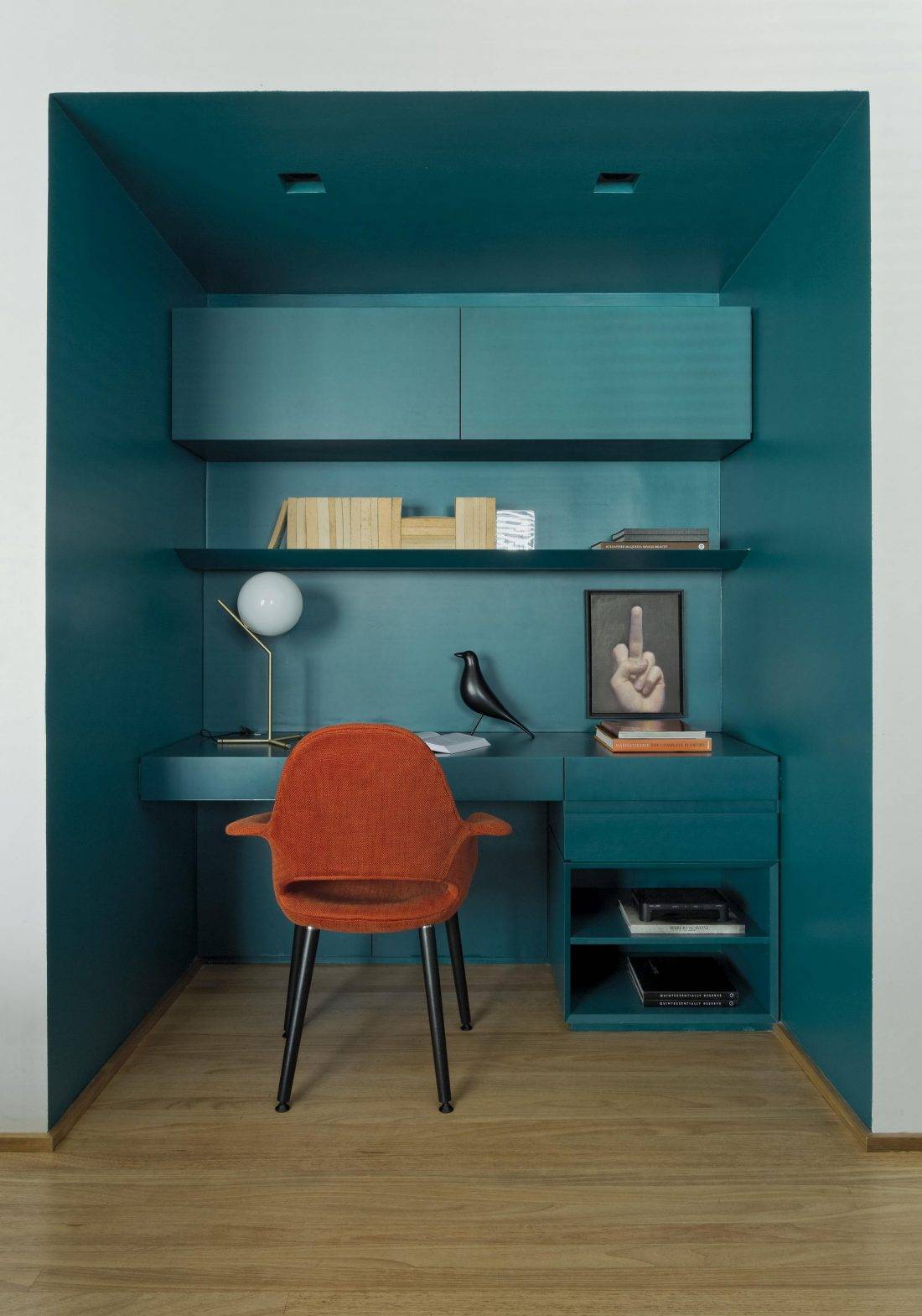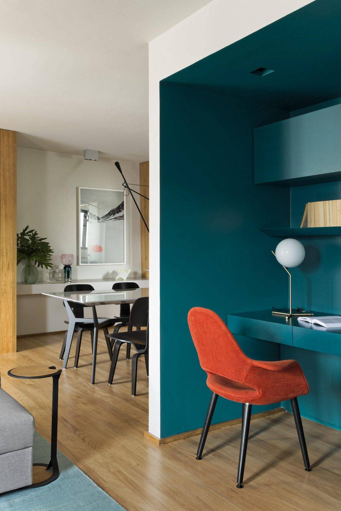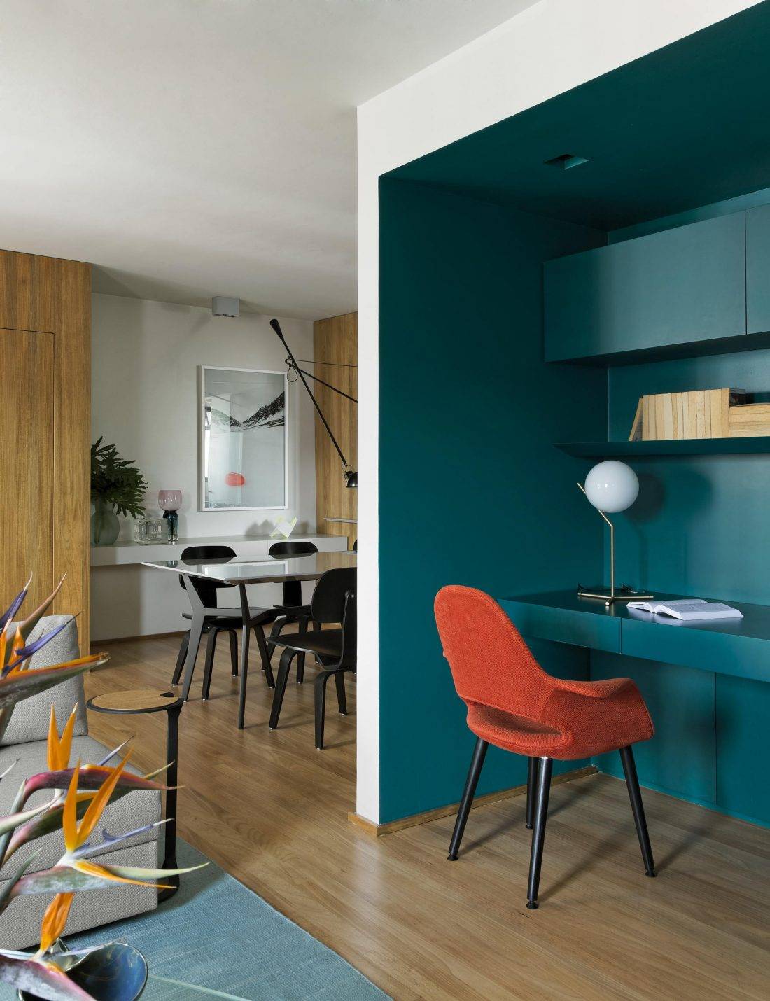 В своеобразный стеновой модуль встроен рабочий кабинет. Прохладный цвет морских глубин разбивается об огненный красный. Дизайн представленного здесь кресла разработан еще в 1940 году Чарльзом Имсом и Ээро Саариненом. Оно имеет и свое название — «Conversation Chair», то есть «кресло для общения». Открытость и удобство помогли ему завоевать популярность по всему миру