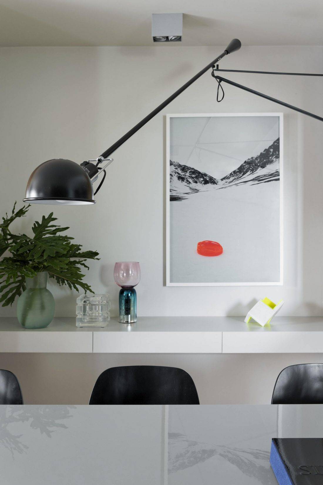 Столовая зона вплотную примыкает к кухонной, щадя свободное пространство. Функциональный стол с устойчивыми металлическими, но не массивными ножками и гладкой ровной поверхностью приглашает в 60-е года. Стулья Eames DCW (Dining Chair Wood) от дизайнеров Чарльза и Рэя Имс изготовлены из формованной фанеры. Они очень удобны, несмотря на внешнюю простоту. Оригинальная идея дополнительной подсветки столовой зоны воплощена с помощью черной металлической лампы простой формы на необыкновенно длинном держателе. Аксессуары, расставленные на подиуме вдоль стола, равно как и изображение в застекленной рамке, оставляют открытые вопросы и простор для фантазии