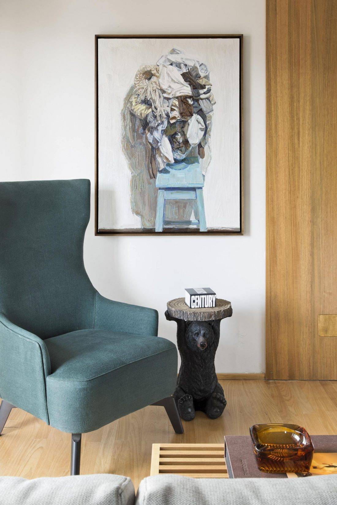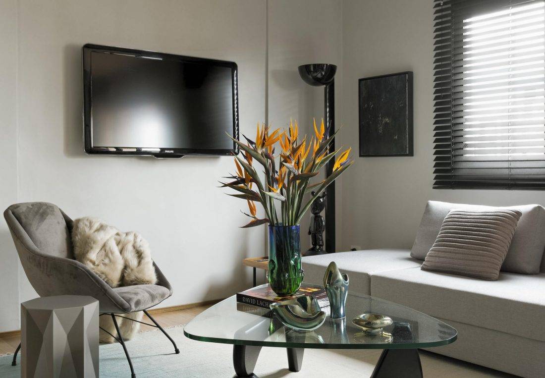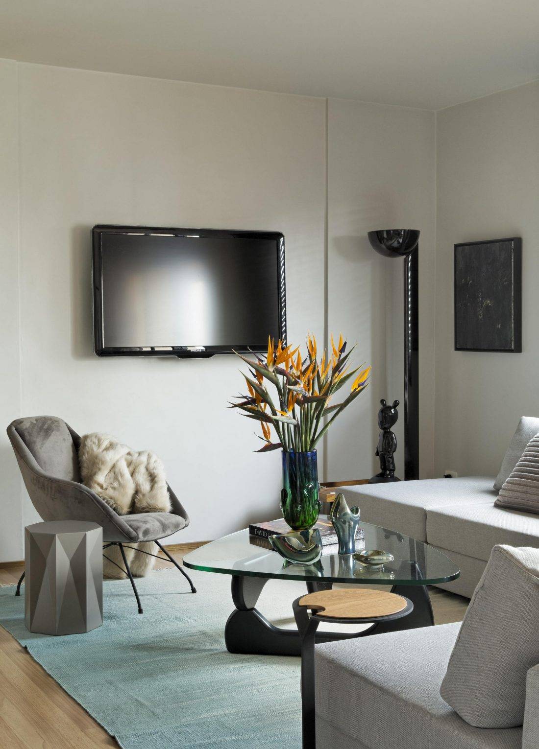 Благодаря эргономичной планировке, в небольшой квартире нашлось место для зоны отдыха, расположенной у окна. Она представлена удобным креслом нежного цвета морской волны, столиком с основанием в виде медведя, и вторым многофункциональным раскладным столом с металлическим корпусом и поверхностью из деревянных реек. Пепельница с толстыми стеклянными стенками, книга и фотоальбом говорят о привычных для хозяина квартиры способах проводить в свободное время.