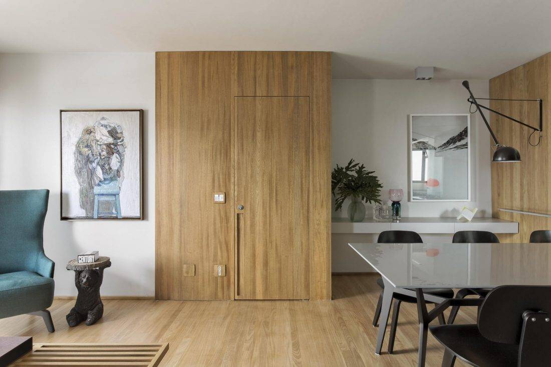 Белый потолок и стены визуально расширяют границы небольшой квартиры и наполняют ее светом. Текстура напольного покрытия перекликается с внешней отделкой кухонного острова и дверных зон, задавая интерьеру неагрессивный, ровный ритм. Светлый нежный тон дерева вкупе с белизной составляют общий фон, на котором четко расставлены темные точки акцентов.