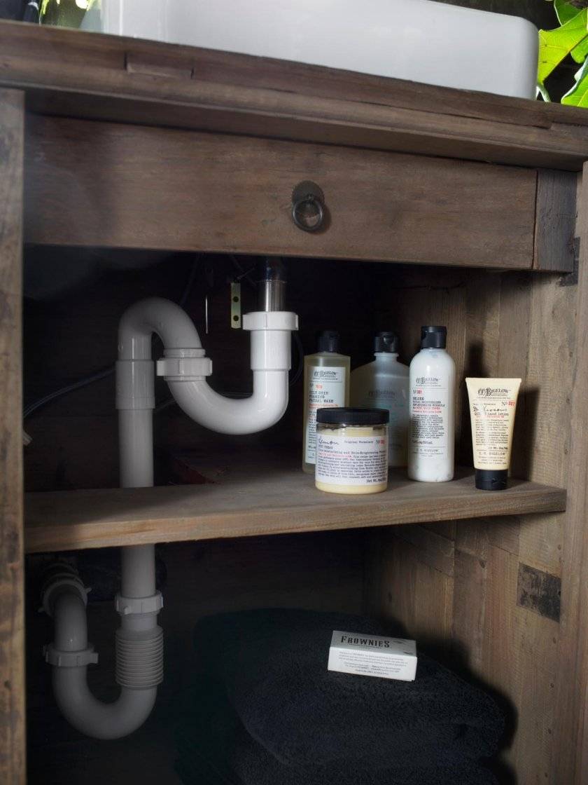 Выбрав предмет мебели сообразно расположению труб, его придется немного видоизменить. Задняя стенка демонтируется, а в боковых или верхней (в зависимости от того, горизонтальные трубы приходится прятать, или вертикальные), делаются вырезы. При этом не стоит забывать о специфической особенности ванной комнаты – высокой влажности.