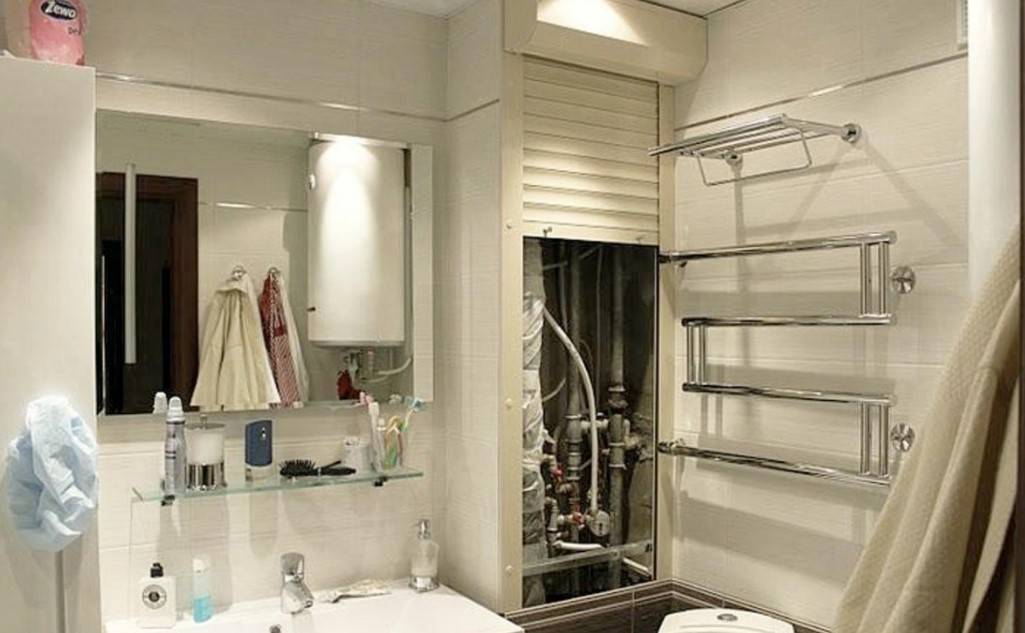 Существует вариант, в случае реализации которого коммуникации будут незаметны, а доступ к ним останется свободным. Для этого задействуют рольставни и жалюзи. В этом случае, чтобы добраться до вентилей или счетчика, потребуется отодвинуть в сторону шторку и полноценный доступ к ним будет обеспечен.