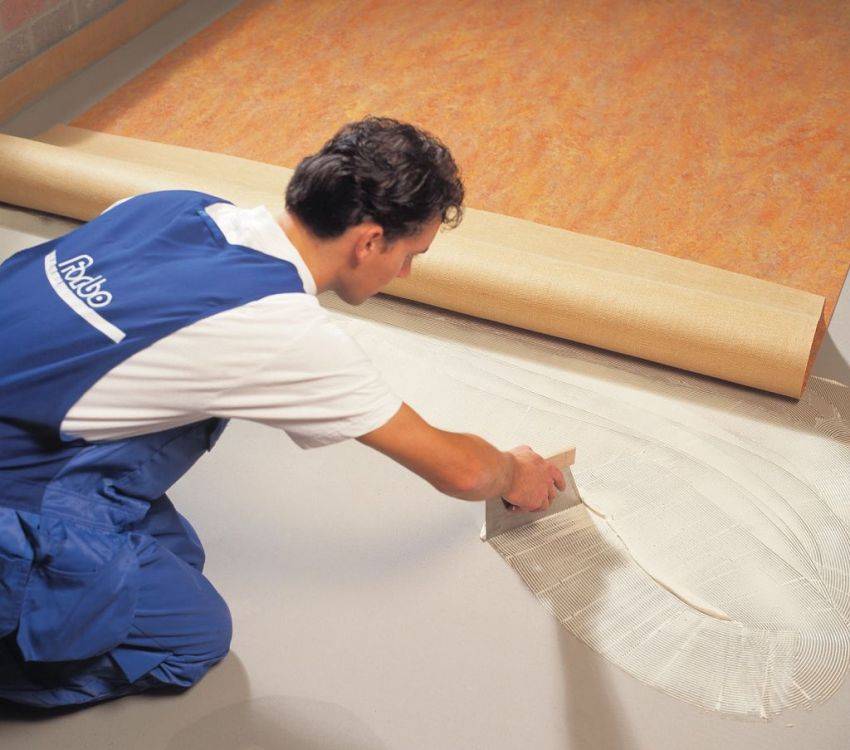 Сначала клей наносят на черновой пол, а только по истечении 15 минут на линолеум