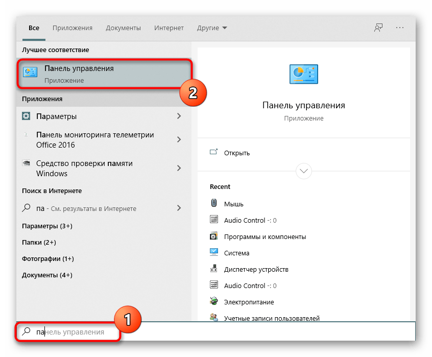 - Откройте «Пуск» и через поиск найдите приложение «Панель управления».
