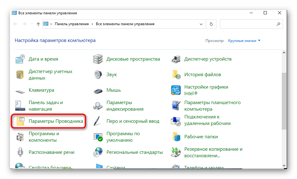 - В поле просмотр поставьте «Значки», если там установлено «Категории» и выберите пункт «Параметры проводника».
