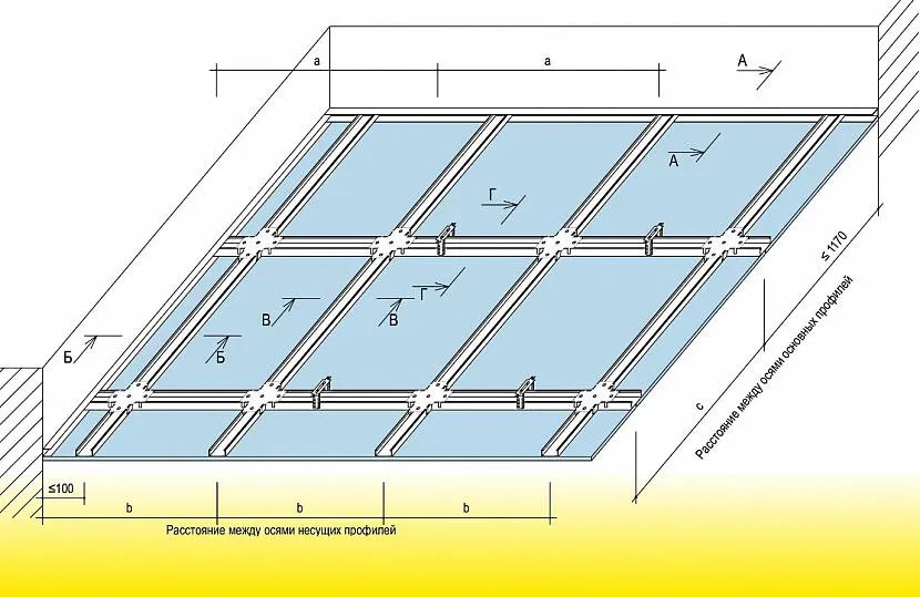 - Сам каркас сооружать можно подвесами или направляющими профилями в виде буквы «Г».