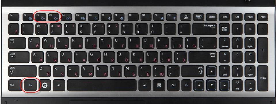 На ноутбуках Samsung это могут быть клавиши F2 и F3. Разумеет в паре с клавишей FN.