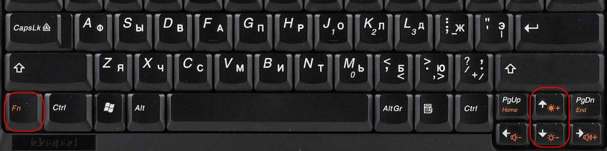 На клавиатуре ноутбука существует специальная клавиша Fn — она используется для набора альтернативных команд. Одной из этих команд является регулировка яркости экрана. Как правило, яркость обозначается значком солнышка (заполненным и пустым). Соответственно, что бы отрегулировать яркость, вам необходимо зажать кнопку Fn, а затем нажать либо на заполненное солнышко для увеличения яркости, либо на пустое солнышко для затемнения. Больше ничего нажимать не нужно.