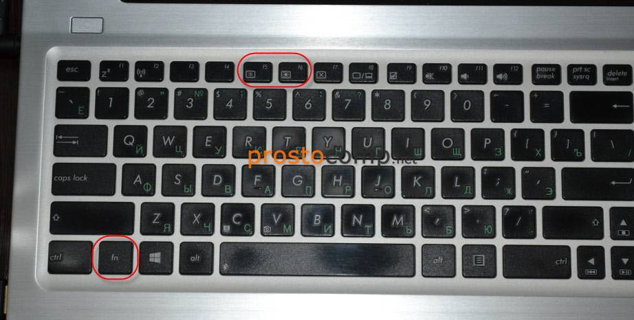 - Asus: «F7» — уменьшение яркости экрана, «F8» — увеличение яркости.