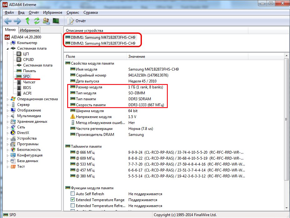- Все остальные показатели – тип, тайминги, скорость, производитель и так далее, можно увидеть, развернув пункт SPD.