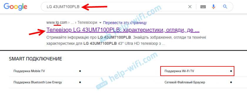 Возьмем модель LG 43UM7100PLB. Находим эту модель на официальном сайте LG и смотрим технические характеристики (спецификации). Если напротив «Поддержка Wi-Fi» стоит точка – значит есть поддержка.