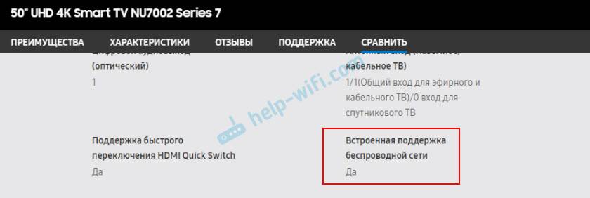 Точно так же все можно проверить на сайте Samsung. Берем модель, например, UE50NU7002UXUA и находим страничку с ее характеристиками на сайте Samsung. «Встроенная поддержка беспроводной сети» – «Да»!