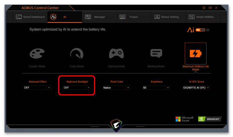 Если вы приобрели модель из серии AORUS, скорее всего, на вашем ноутбуке уже будет предустановлен Control Center. Если это не так, понадобится установить фирменную программу с официального сайта. В ней вы должны найти параметр «Keyboard Backlight» и перевести его в значение «On», чтобы активировать подсветку клавиатуры без использования клавиш на ней.