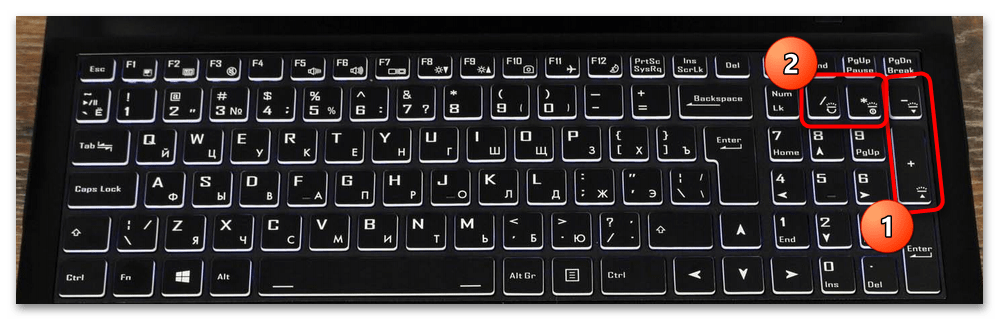 Многие модели лэптопов от Gigabyte тоже оснащены подсветкой. В большинстве случаев управление ей осуществляется одинаково. Функции, отвечающие за увеличение, уменьшение яркости, включение или отключение подсветки вынесены на клавиши цифровой панели, которая по умолчанию будет отключена. Поэтому вы без каких-либо комбинаций можете регулировать яркость, понимая предназначение каждой клавиши по ее маркировке. Если вместо управления яркостью пропечатываются стандартные символы, тоже отмеченные на этих клавишах, попробуйте использовать их сочетание вместе с Fn.