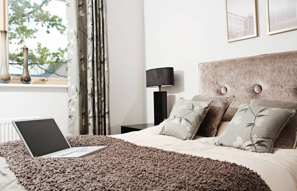 - Оттенки материи подбираются таким образом, чтобы они совпадали с цветом обивки мягкой мебели, находящейся в спальне.