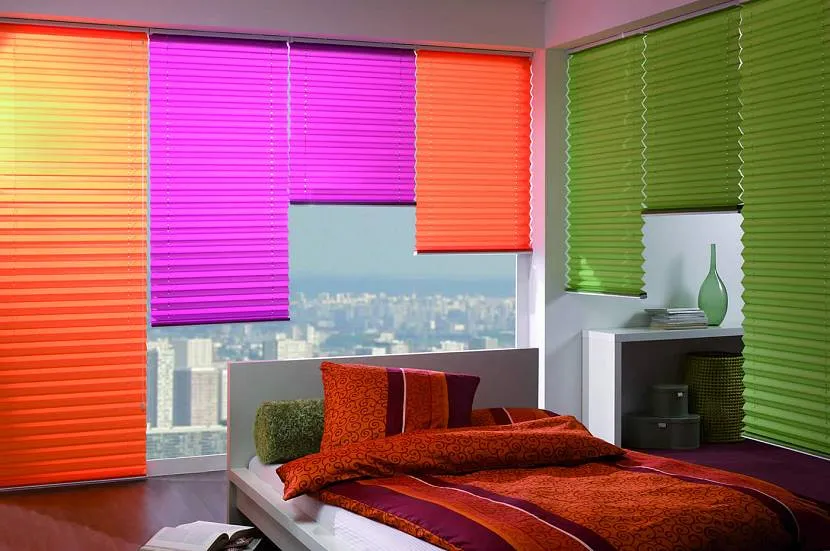 Второй вариант – шторы самой простой формы и конфигурации, но из ярких и сочных цветов. Интересно смотрятся модели, которые закрывают не только окно, а полностью затягивают всю стену. Если же места в комнате не так много – смело выбирай рулонные шторы.