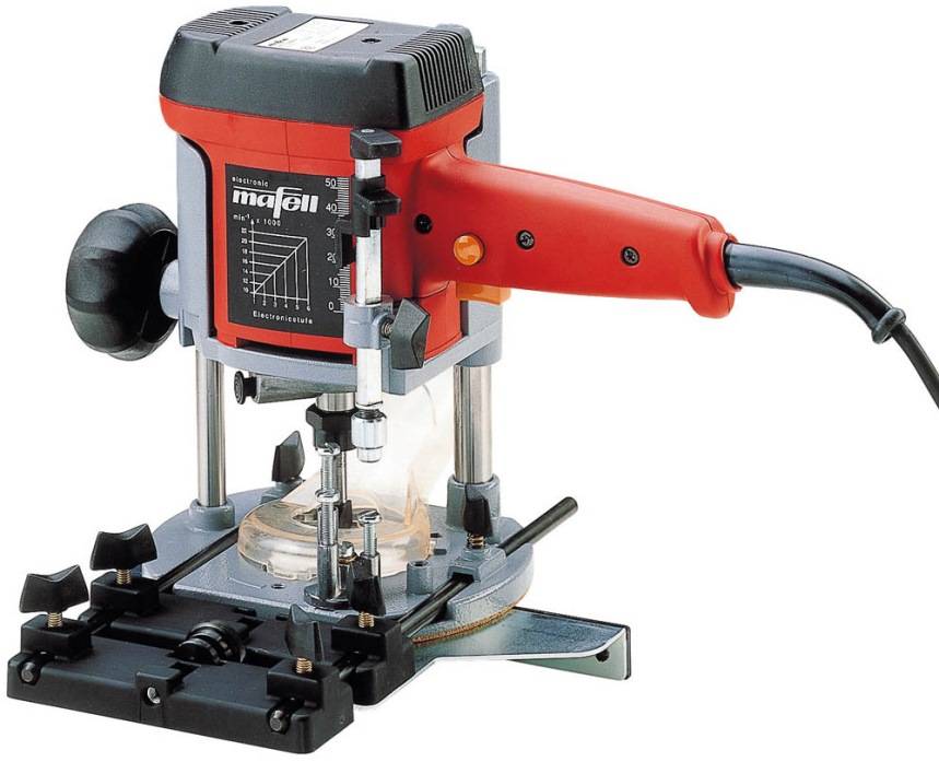 Это тяжелый мощный инструмент для профессионального использования. Он способен заглубиться на 70 мм. Такой ход фрезы позволяет выполнять глубокие ниши в деревянных полотнах. Оператор может выставить нужную глубину фрезерования с точностью до 0,1 мм. Скорость здесь ниже чем у предыдущих фрезеров и составляет 9000 — 21000 об/мин. Однако такая сниженная на первый взгляд скорость обусловлена большей глубиной пропила и возможностью работать с цангами до 12 мм.