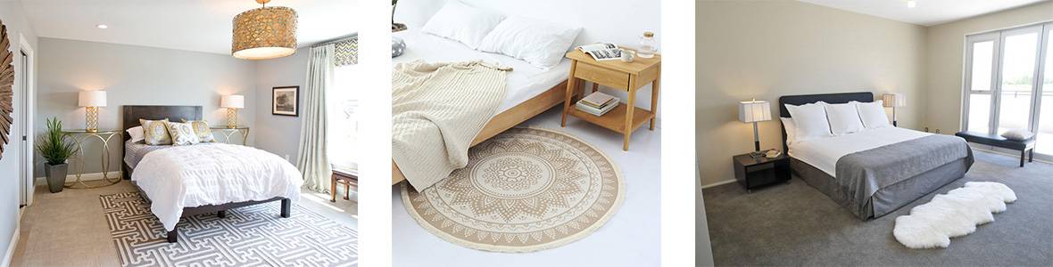 - Ковер у кровати. Этим расположением ковра подчеркивают место для сна – кровать. Ковер может быть небольшой, круглой или прямоугольной формы. Иногда ковер располагают под кроватью. Потребуется ковер таких размеров, чтобы кровать не только полностью уместилась на нем, но и осталось место по краям.