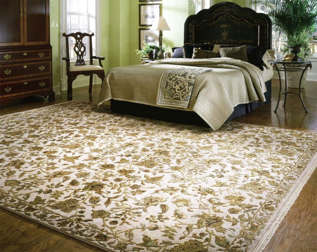 - Спальня. Ковер подбирается так, чтобы он лежал на одинаковом расстоянии от стен комнаты. Хорошо выглядит вариант с большим ковром, закрывающим весь пол.