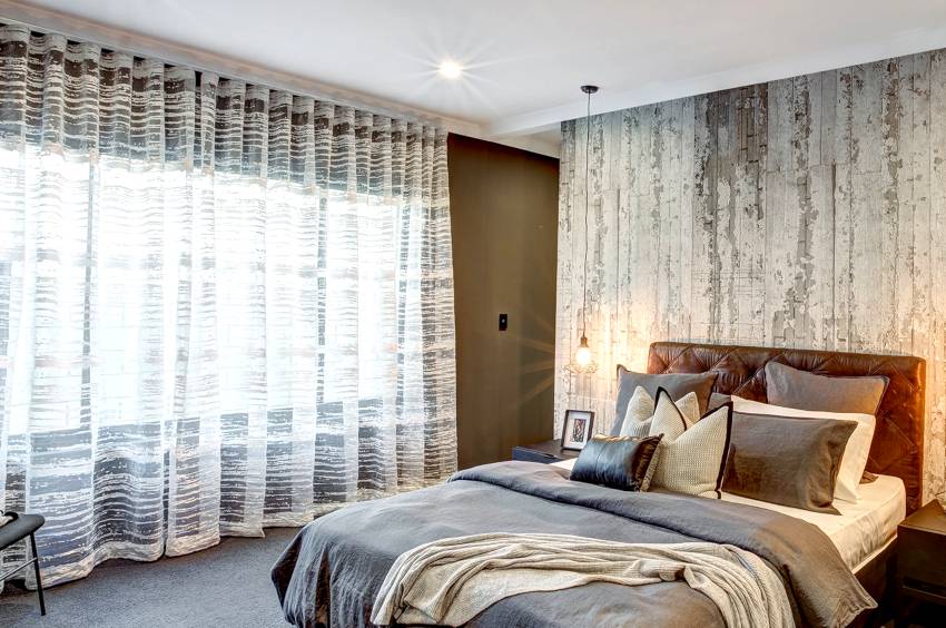 Дизайн штор для спальни в стиле модерн отличается плавно переходящими друг в друга линиями, не сильно насыщенными оттенками и отсутствием броских акцентов. Вы можете выбрать современный абстрактный/геометрический узор или ограничиться однотонными тканями.