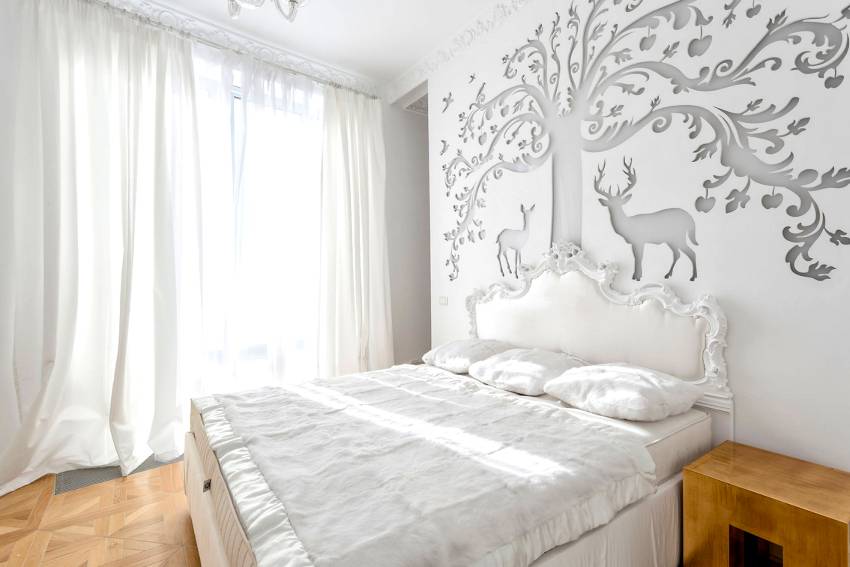 Особенно эффектно будут смотреться двойные шторы в белой спальне.