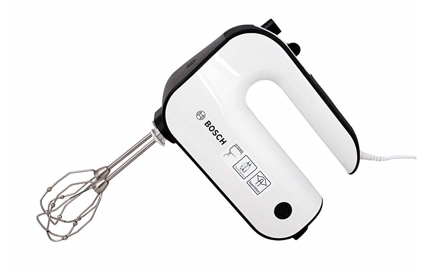 В комплекте с устройством пользователь найдет венчик для взбивания и крюк для замешивания теста. Насадок немного, но зато самые необходимые. Установка и съем осуществляется нажатием специальной кнопки на ручке миксера, что очень удобно. Кроме того, Bosch MFQ 36460 сочетается с насадками других моделей. Больше всего пользователей подкупает то, что это один из самых бюджетных миксеров от Бош. Хотя он не лишен и минусов. Среди них отметим недостаточную мощность и громкую работу на высоких скоростях.