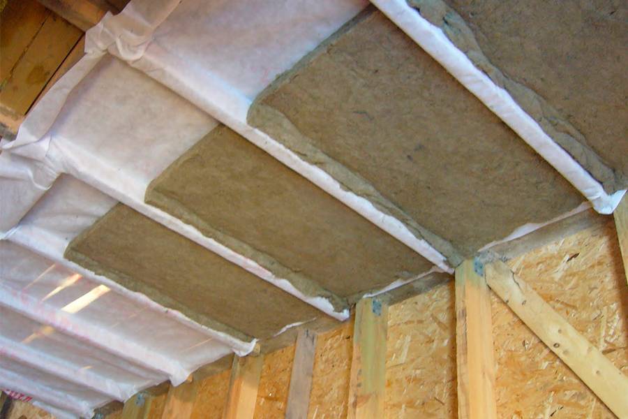 Также неплохо использовать базальтовую вату без фенольной пропитки. Но она легко впитывает воду, поэтому нуждается в качественной изоляции от воды и пара. Вата может быть уложена как сверху на доски настила, так и подшита снизу.